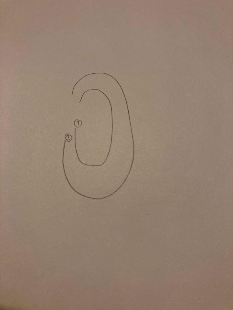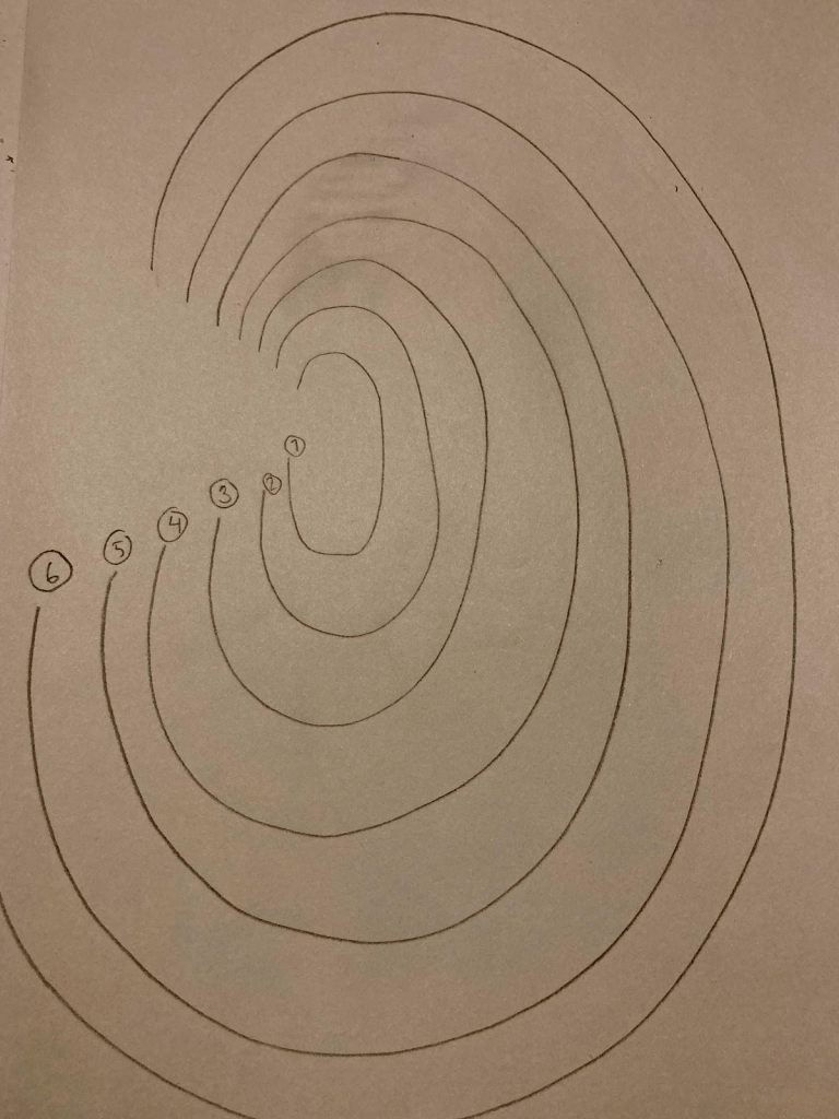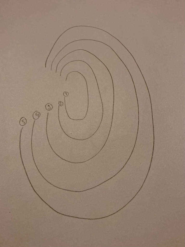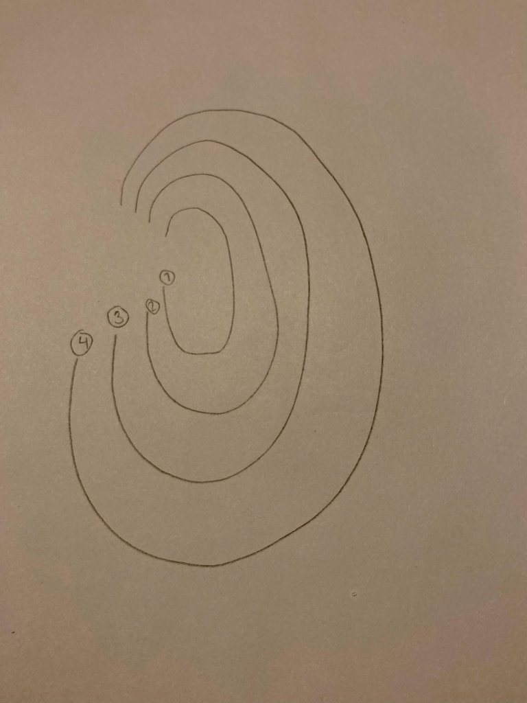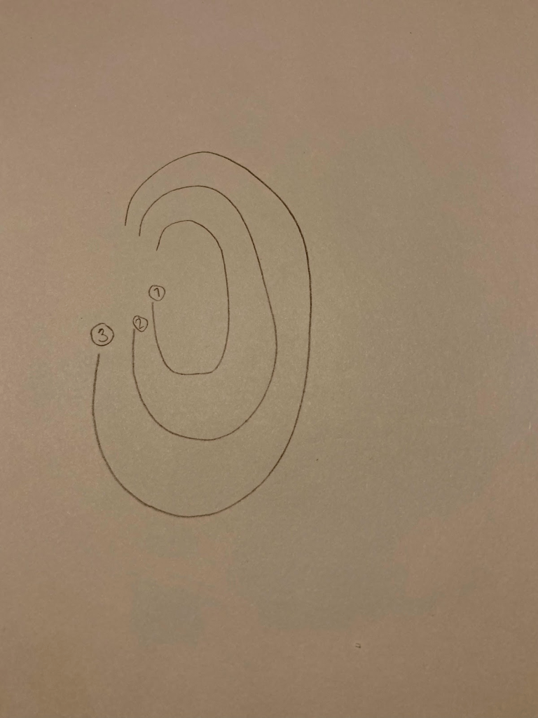 Jossain vaiheessa, ehkä näillä paikkeilla, piirtäessämme (vimmaisesti!) yhä lisää kehiä oivalsimme että kehät alkavat näyttää korvalta. Innostuimme tästä visuaalisesta metaforasta, koska kurssimme dialogiharjoitteiden keskeinen tavoite oli opetella aitoa ja läsnäolevaa kuuntelua – ja mikä olisi selkeämpi metafora kuuntelemiselle kuin korva.
