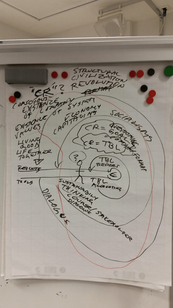 Muistamme, kuinka istuimme erään luennon jälkeen luokkahuoneessa pohtimassa luokassa tapahtunutta dialogisen harjoitteen herättämää keskustelua. Kyseessä oli vuosina 2011 – 2018 opettamamme kurssi Dialogues on Corporate Responsibility in Global Economy (CRinGE), jota tarjottiin valinnaisena kurssina Aalto-yliopiston Creative Sustainability -maisteriohjelmassa. Aloimme purkaa auki erilaisia, toistensa ohi puhuttuja asioita, jotka eivät kohdanneet keskustelussa. Miten voisimme tuoda yhteen näitä asioita, jotka tuntuivat kaikuvan toistensa ohi? Miten voisimme ymmärtää paremmin erilaisia asenteita yritysvastuuseen? Miten voisimme käsitellä kestävyyskysymyksiä samaan aikaan sekä henkilökohtaisella että yhteiskunnallisella tasolla? Ja ennen kaikkea: miten voisimme reflektoida omien työtehtäviemme vastuullisuutta ja toimintatapojemme kestävyyttä?