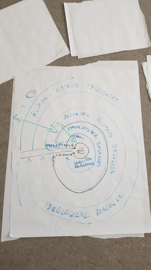 Lopuksi vielä: haluamme tehdä korvamallin kautta näkyväksi kestävyyden eri reflektiotasoja, mutta myös edesauttaa toistemme ymmärtämistä kestävyysteemoissa (ks. myös Houtbeckers & Kallio 2022b). Kun joku ratkoo asioita hyvin konkreettisella arkisen toiminnan tasolla niin toinen saattaa liikkua laajemmalla, arvomaailmaa tai tietokäsitystä pohtivalla tasolla. Samalla nämä tasot (kehät) ovat kuitenkin kytköksissä toisiinsa, sillä käytännöllinen toiminta ei ole mahdollista ilman, että sen taustalla on filosofisempia asioita ja toisaalta filosofisten asioiden pohtiminen ei poista sitä tosiasiaa että joudumme elämään arkea, suorittamaan työtehtäviä ja ratkomaan konkreettisia asioita jatkuvasti.